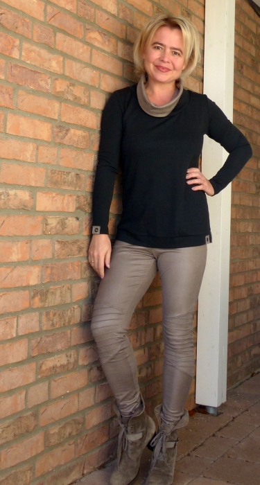 Genau wie hier wählte ich den großen, tiefen Ausschnitt und habe den Rollkragen “dazu gebastelt”. Halb Kunstleder, halb Jersey. An einem Ärmel und am Bündchen sind noch kleine Ösen auf einem Stückchen von meinem Kunstleder angebracht.