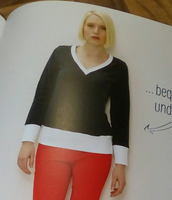 Für den Anfang suchte ich ein Sweatshirt mit einem V-Ausschnitt aus. Das Modell gefiel mir auf Anhieb und außerdem habe ich noch nie ein Kleidungsstück mit dieser Ausschnittform genäht. Das wollte ich endlich ändern.